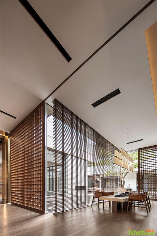 在漂浮的兩個盒子中,洽談區(qū)透過折門的運用,將沙發(fā)區(qū)整體空間打開與中庭水面連結(jié),將內(nèi)外空間連成一體,雨天時可以在沙發(fā)上細聽雨聲。茶室則是以較低臺度的家具設(shè)定,接近席地而坐的高度讓使用者與水面的尺度感更親近一些,并透過格子窗扇,在黃昏時讓交錯的光影灑落在茶室的空間之中。