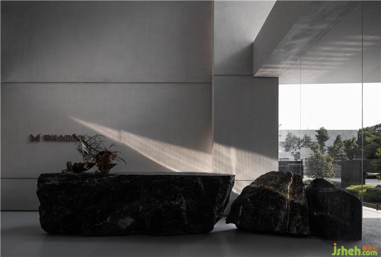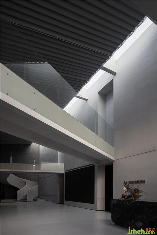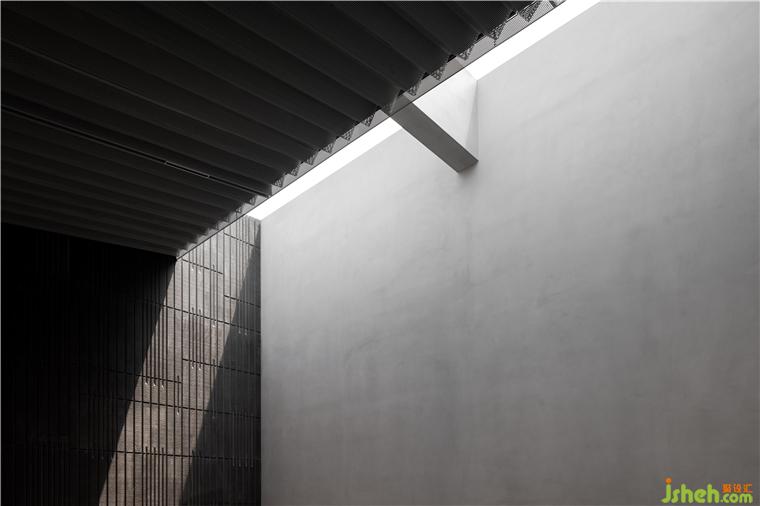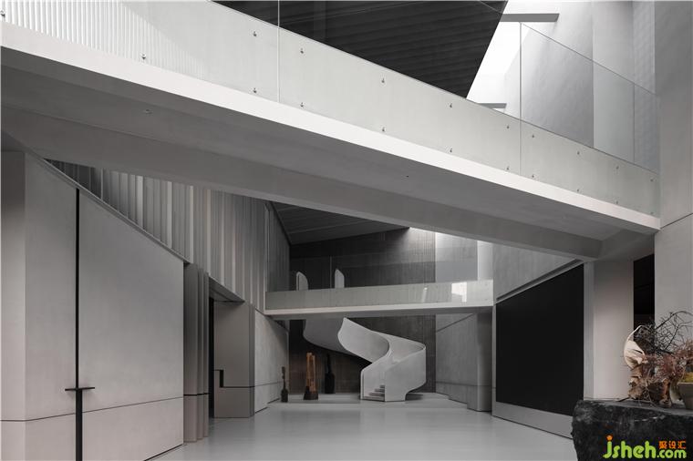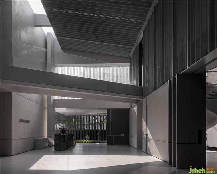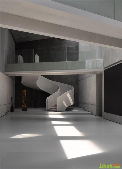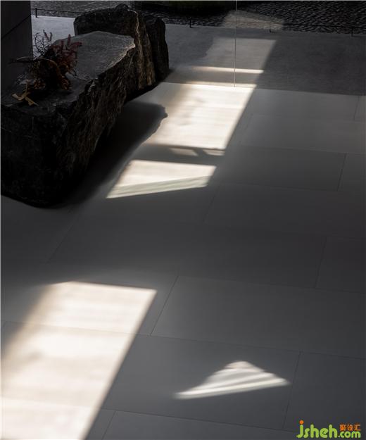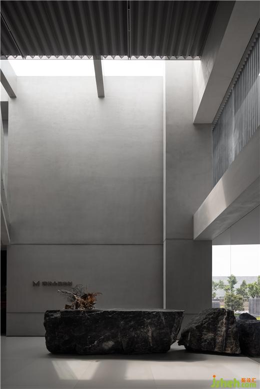 在入口處水洗石的臺階燈光將參觀者逐級而上引至一面玻璃窗前,從中可以瞥見展廳內(nèi)的一小部分作品,猶如為展廳準(zhǔn)備的一段序言。再往前轉(zhuǎn)折是一條悠密的長廊,其靠水一側(cè)增加了簡單的線性金屬構(gòu)件,用于容納照明器具并引導(dǎo)參觀者進(jìn)入展廳內(nèi)部。佛山瑪格展廳裝修設(shè)計與展廳中的藝術(shù)品一樣,這項簡單的裝置亦在試圖創(chuàng)造一種直接而又打動人心的體驗。