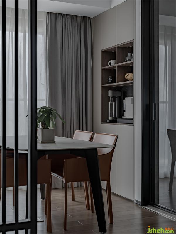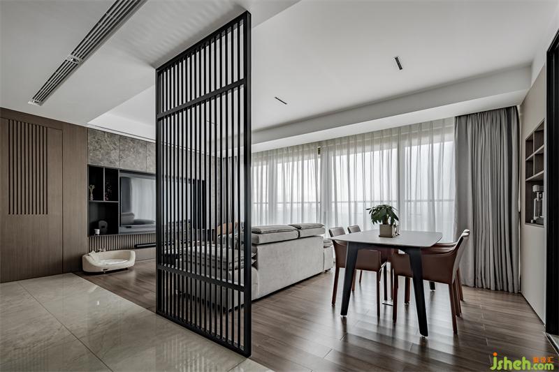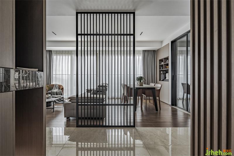 玄關(guān)與客餐廳之間立了一幅屏風(fēng),起到隔斷的作用,既朦朧優(yōu)雅又不沉悶,陽光透過格柵呈現(xiàn)出一種朦朧之美。