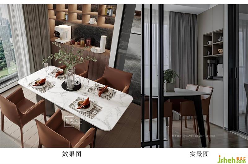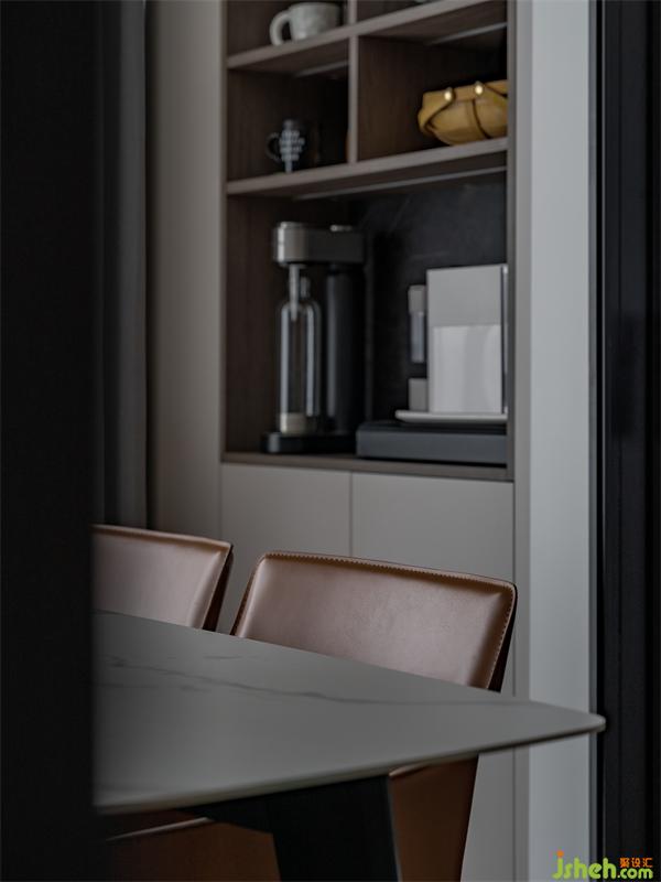 餐桌選用了一張大理石巖板桌,配上馬鞍皮質(zhì)餐椅,用餐的儀式感瞬間拉滿了。
