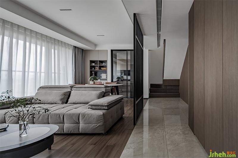 走廊旁看著全是木板,其實全是柜子。柜子里放置各種雜物,如生活必需品、男主人的釣魚裝備、狗狗的口糧、用品等。電視柜左側(cè)是一扇隱形門,能與墻面及電視柜完整的融合在一起,形成一個整體。