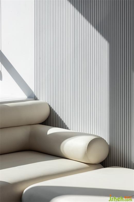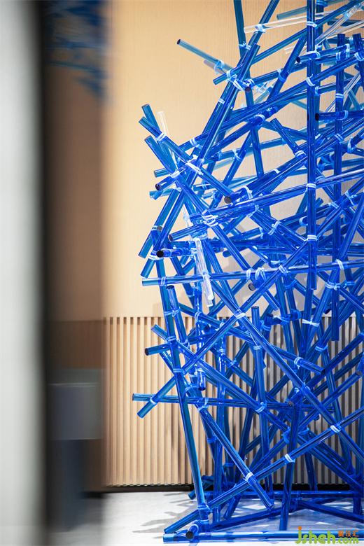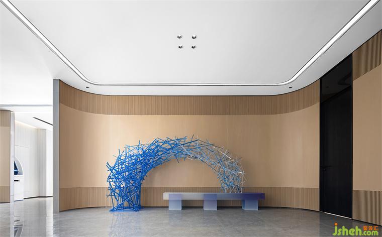 筆挺剛勁的樹(shù)脂材料進(jìn)行形式化的重疊,圍合組成二分之一圓,銷(xiāo)售中心設(shè)計(jì)在二層空間與“光之印跡”彼此呼應(yīng),更為跳躍的藍(lán)色是浮動(dòng)在空間之海上的泡沫,喚起生機(jī)和想象。水、光線(xiàn)、宇宙和往復(fù)進(jìn)入的人共構(gòu)一條河流,它的無(wú)限性將過(guò)去、現(xiàn)在和未來(lái)聯(lián)系在一起,而空間便是時(shí)間的河床,將一切承載。