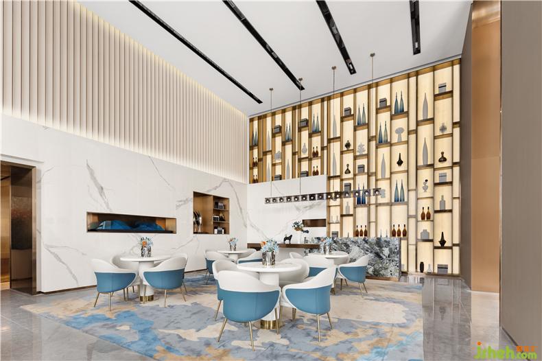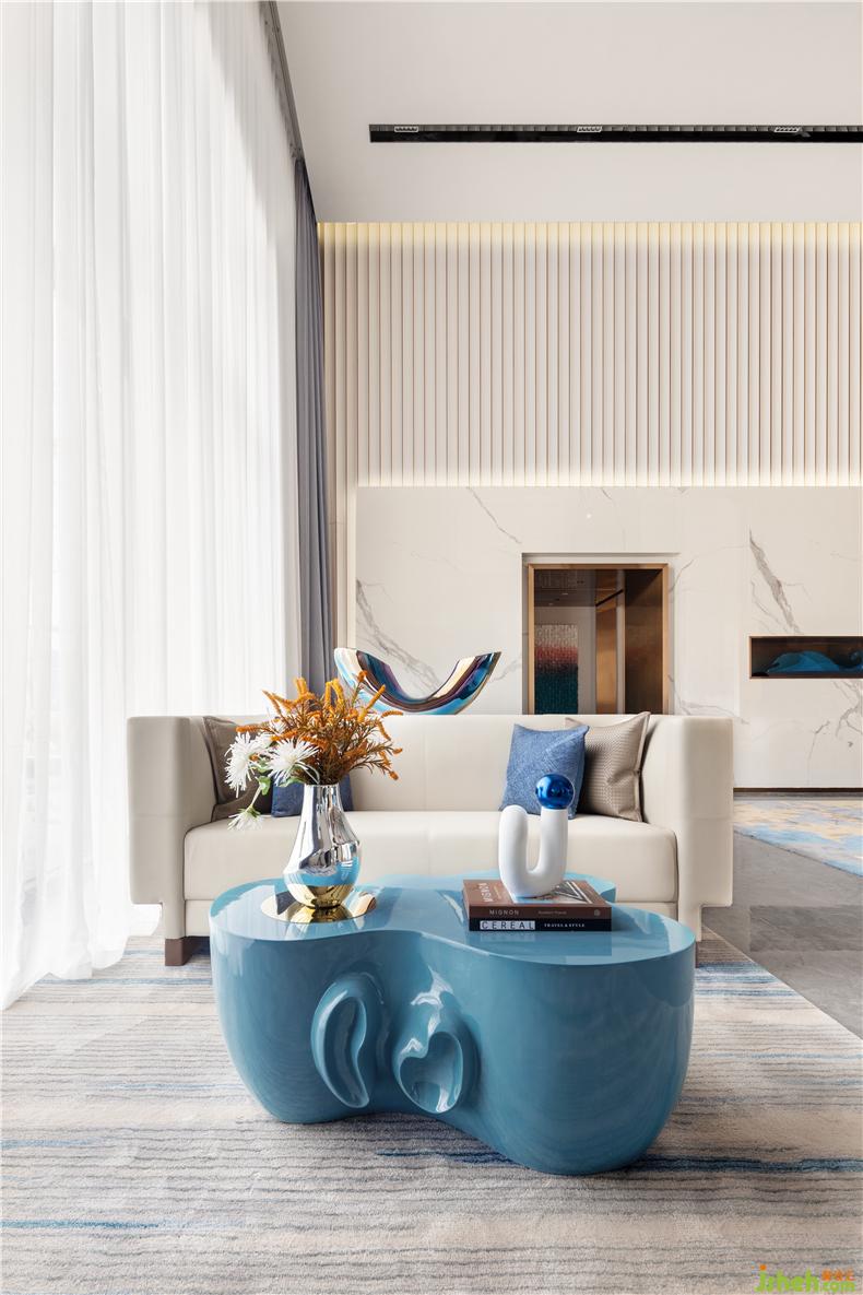 跟隨室內(nèi)層高,我們形塑出空間的體量感與連續(xù)性,白色大理石白和波紋板分割空間高低,售樓處設(shè)計打破沉悶的立面。水之藍(lán)的純凈則賦予空間靜謐安寧的氣質(zhì),當(dāng)我們處在平靜自在的環(huán)境中,感官也自然地沉浸于此。