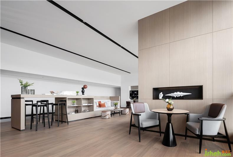 順著空間的軌跡,設(shè)計回歸了本真,僅關(guān)乎線條。長條形組合內(nèi)嵌式沙發(fā)與展示桌給過道替換出足夠的活動空間,既保證了空間的流暢性,又起了隔斷作用。