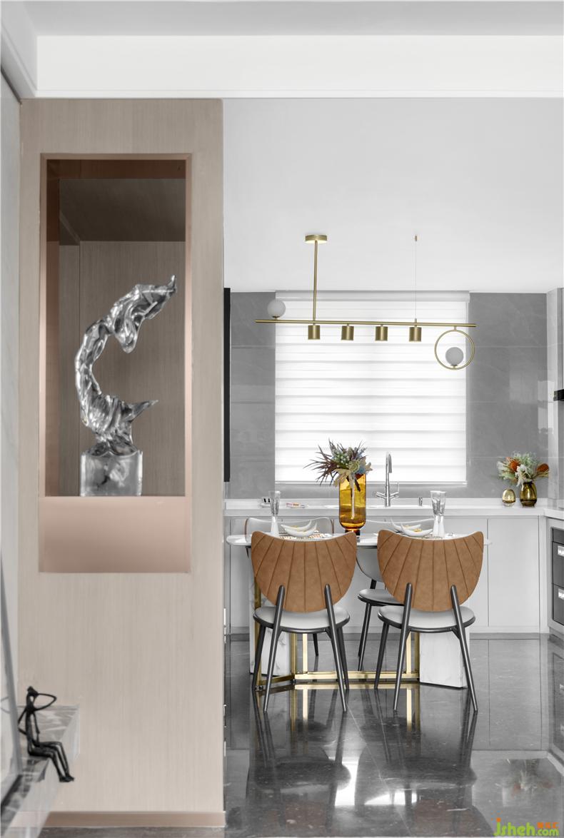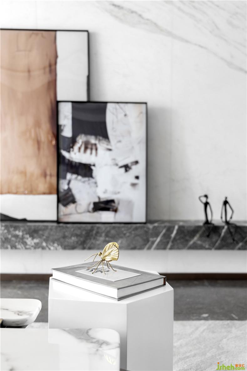 在這詩意之下,光滑的大理石映上清晨的冬日,增添了一份專屬的靜謐。素雅的空間色彩以及有序擺放的藝術(shù)擺件,在明亮的光線下慢慢浸潤出質(zhì)感。樣板房設(shè)計