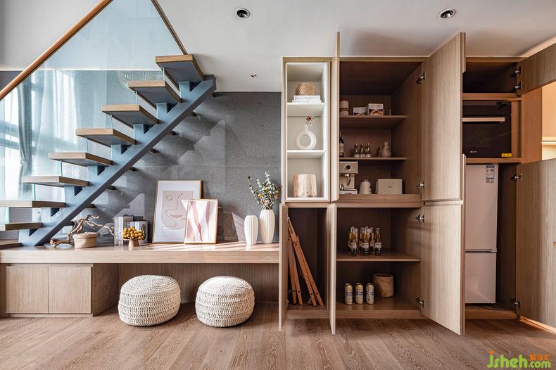 約4.5米的層高消除了空間的閉合感,木色沿著過道爬上地面和墻面,帶來秋天恬靜的氣息。樣板房設(shè)計(jì)籐編藝術(shù)吊燈與光的柔美結(jié)合,充分體現(xiàn)出自然材質(zhì)的美感