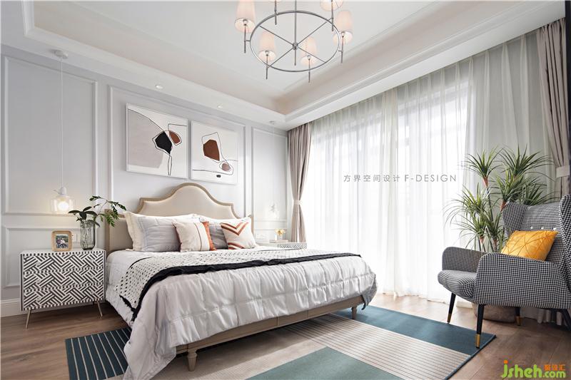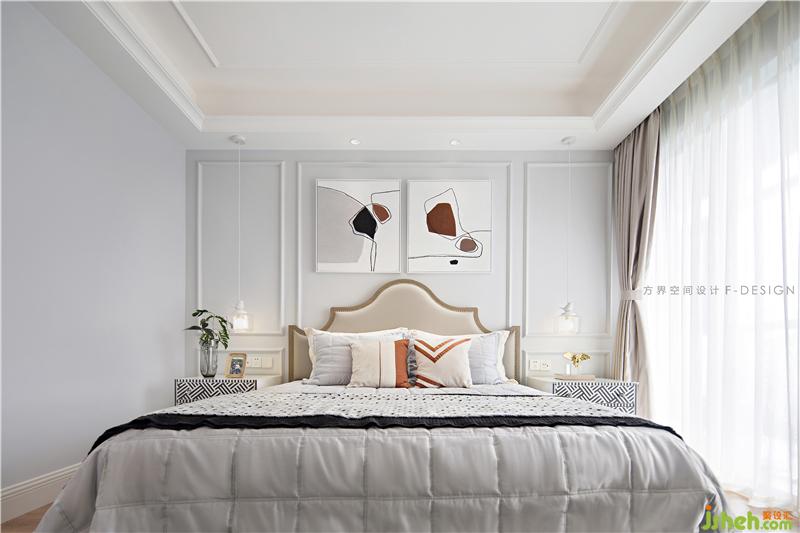 沿用空間主體色調(diào),把紅色作為點綴色,為空間增添有彩色。床頭柜黑與白的碰撞,圖案元素的重復組合,繁而不雜。綠植的擺放恰如其分,為空間帶來生氣。