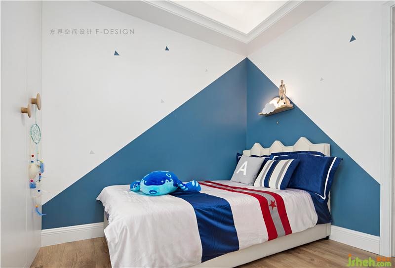 “鯨魚寶貝是媽媽在我剛出生的時候買給我的”,男孩跟我們開心的分享。男孩房選用藍色作為主題色,藍色是大海的顏色,純凈,寬闊。男孩房沒有做太多的裝飾,墻面只是簡單的幾何拼色,只有最單純的顏色才能喚起最強烈的心靈感受。