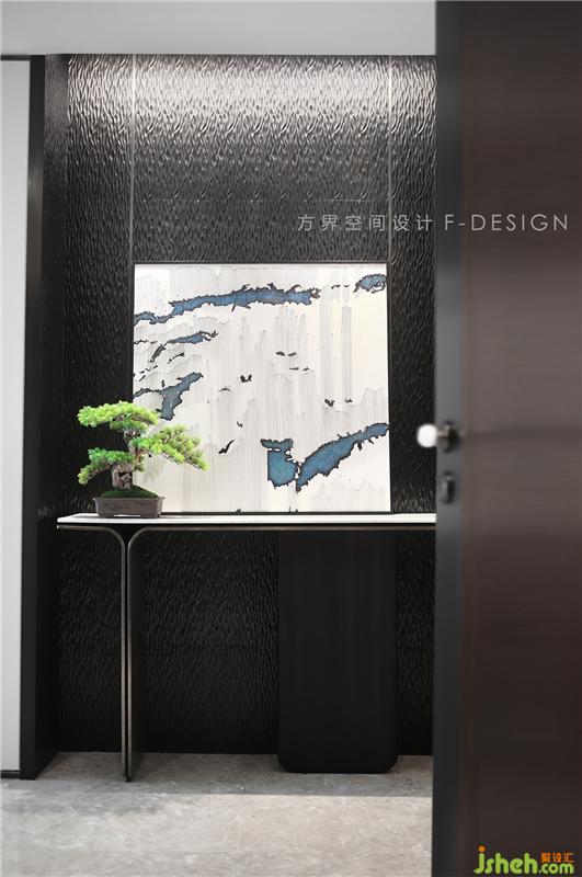 打開入戶門映入眼簾的是一個寬敞的門廳,一盆羅漢松、絹絹刺繡的山水畫,直接點出我們的主題。
