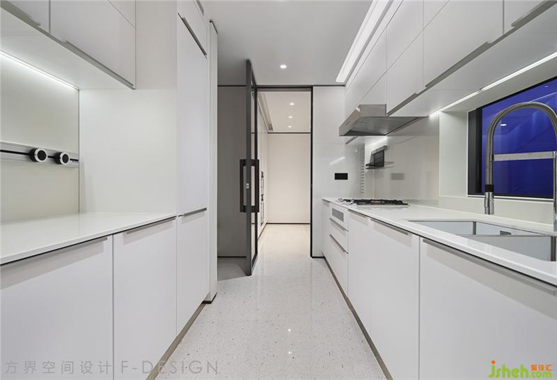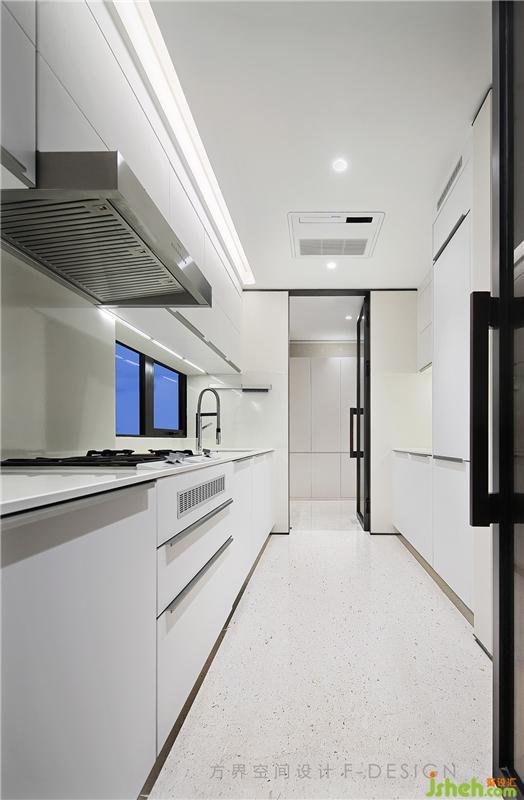 廚房,臨洗菜盆的位置有兩個窗戶,白天陽光照射進來,置身在廚房做飯的人都倍感舒服。廚房整體大面積采用白色,用最簡潔的直線條分割出純淨(jìng)質(zhì)樸的空間感。