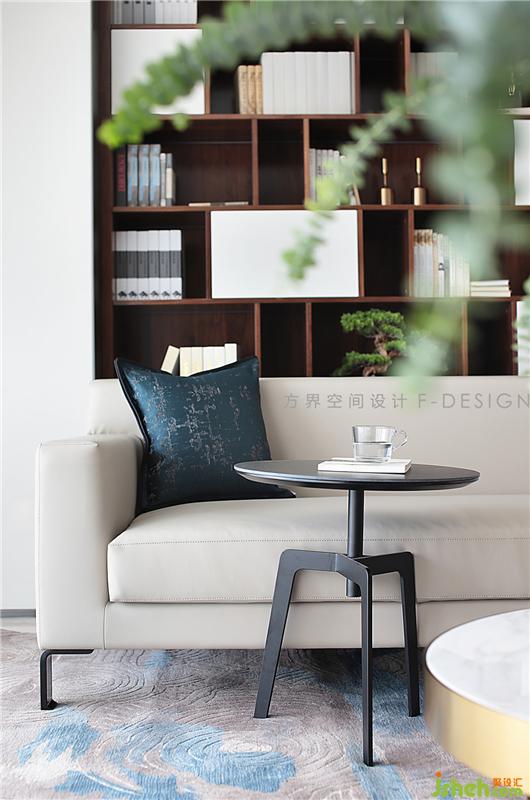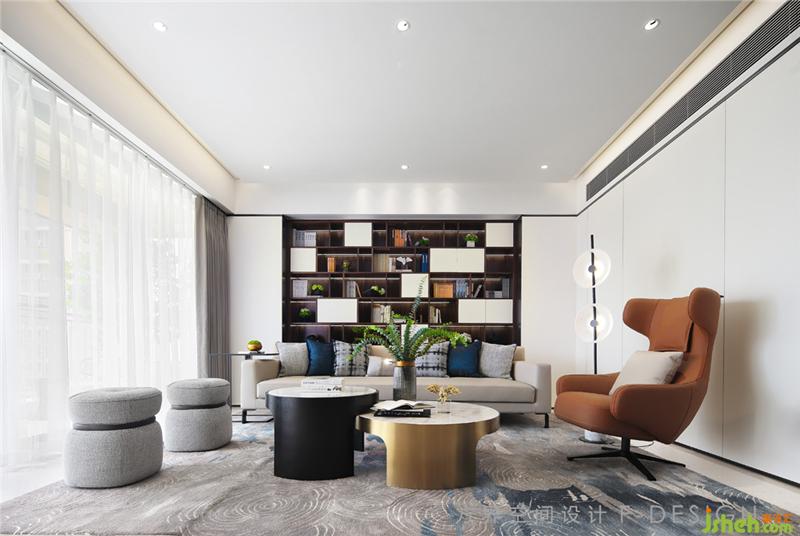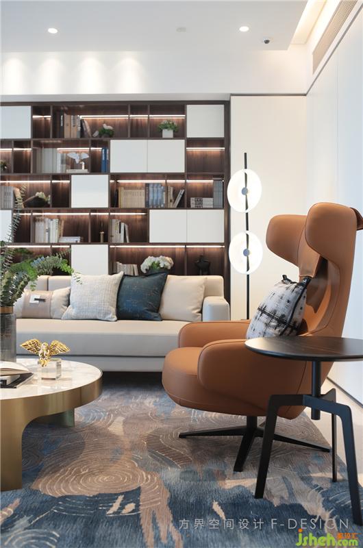 而旁選用一盞落地?zé)糇鳛檠b飾,旁邊的橘色單人沙發(fā)椅也在空間中添了一抹色彩,豐富了空間的視覺效果。