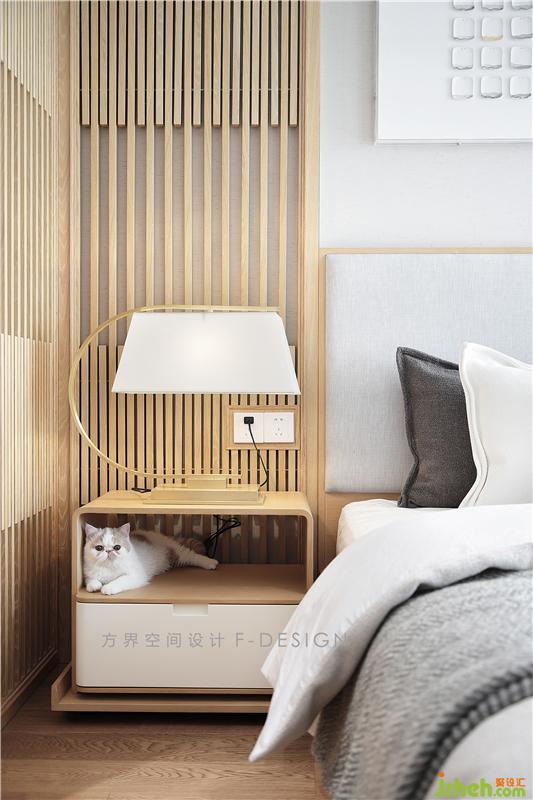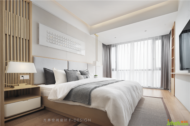 清暉影綽綽,風動一室香。主臥以溫潤色營造舒適的氛圍感,巧妙的通過木格柵彌補了墻面的空白,與主衛(wèi)、衣帽間做隔斷,一弦一柱,細節(jié)精美,增添空間的質感。