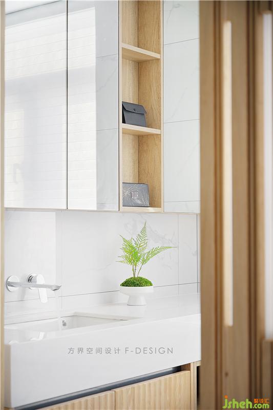 大面鏡子讓空間看起來更加寬敞,木色的儲物格、白色墻面,木質點綴,柔和的色彩表達出空間干凈整潔。