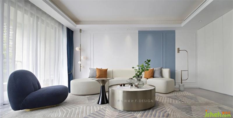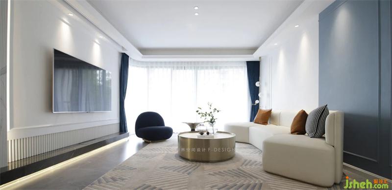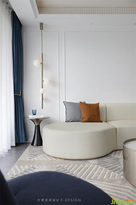 客廳是寬敞大方的格調(diào),依舊是白色的主色,點(diǎn)綴藍(lán)色的窗簾和沙發(fā)。作為重要的交流和會(huì)客空間,在功能和美學(xué)上都達(dá)到了統(tǒng)一。納入自然光線的大面積玻璃窗,讓光線在空間中肆意流淌,時(shí)間緩步前行。