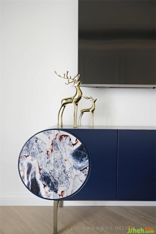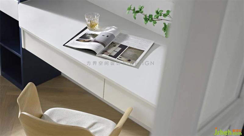 柜子采用白色烤漆板,搭配金屬拉手,讓整個(gè)空間的視野更加開(kāi)闊,明亮。梳妝臺(tái)上方用的是異形智能梳妝鏡,打開(kāi)開(kāi)關(guān),光線(xiàn)可以柔和空間。