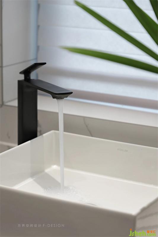 洗手臺(tái)的龍頭采用墻出龍頭,整體設(shè)計(jì)會(huì)更加干凈,美觀。黑色的龍頭和淋浴隔斷呼應(yīng)。