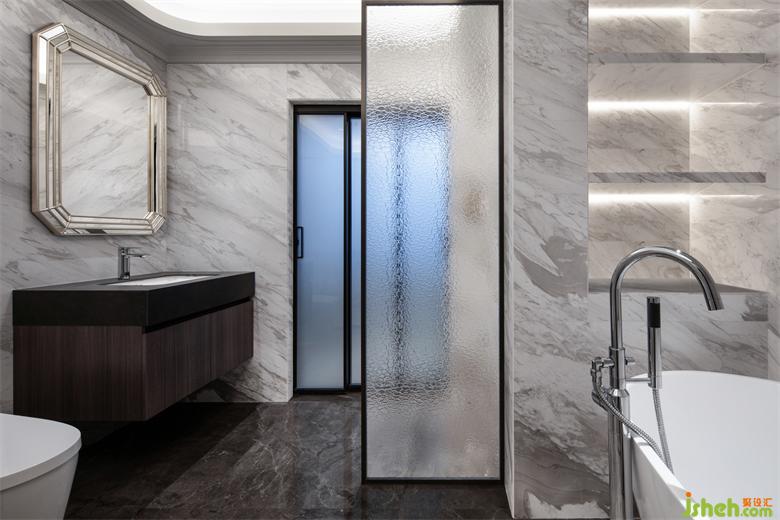 經(jīng)過衣帽連廊,繼而來到主臥,主臥套房延續(xù)圓弧元素,TRID添睿室內設計在空間中延伸和舒展,自然的深色木與淺色墻面色彩的對比分明,恰如其分,寧靜舒適。