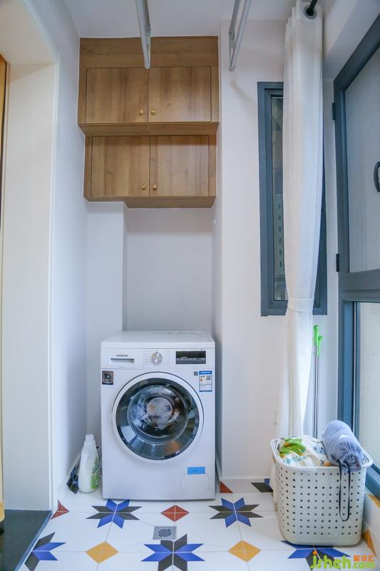 室內(nèi)設(shè)計師在陽臺上更注重功能性,左側(cè)是專門的洗衣區(qū),洗衣晾衣一步到位。頂部的雙層吊柜擁有雙倍的儲物空間,可以容納更多的囤貨。右側(cè)的儲物柜則是留給行李箱、吸塵器等大件物品。