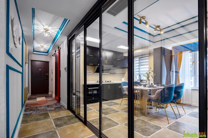 一進門,這套作品就已經(jīng)很驚艷惹!藍色的線條配上燦爛的燈光,流光溢彩間給人一種美的享受,原本過于狹窄的過道,成了藝術(shù)走廊。地面用不同的花磚劃分出區(qū)域,墻面的藍色線條一直延伸到客廳,將各個獨立的空間連貫起來。