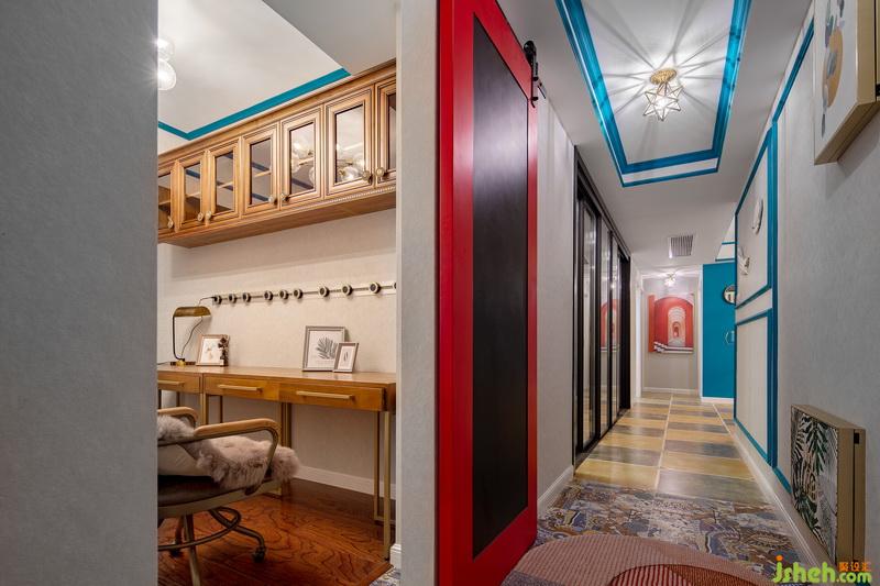 一旁的紅+黑配色的谷倉門,更是讓人一眼就愛上,它與過道盡頭的魔幻裝飾畫遙相呼應(yīng)!門后還暗藏玄機,藏有一個書房!