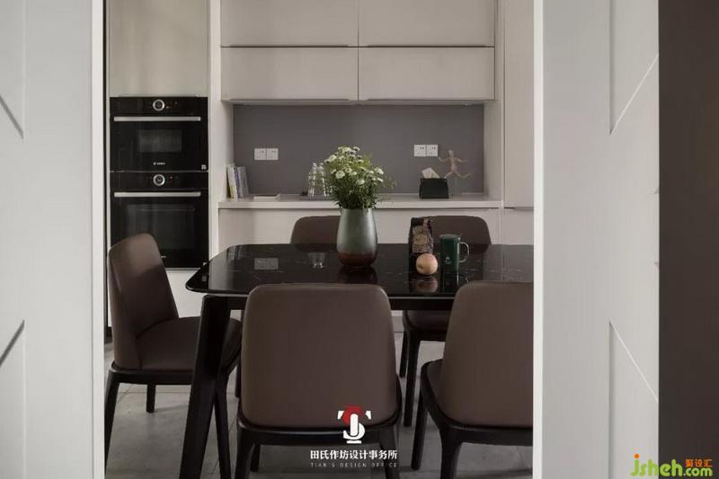 白色的餐邊柜使餐廳有足夠的收納空間,同時(shí)嵌入式的烤箱和蒸箱節(jié)省了廚房的空間也方便西廚的使用。白色的谷倉門在油煙大時(shí)可以關(guān)上,平時(shí)打開不僅美觀,也使得空間更寬闊。
