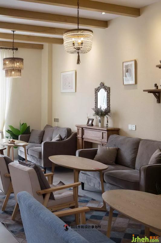 店內(nèi)室內(nèi)設(shè)計師采用米黃為主色調(diào),復(fù)古精美的墻掛式鏡子、胡桃木質(zhì)的矮柜與柔軟簡約的布藝沙發(fā)、樺木紋理的小茶幾形成了歐洲中世紀(jì)奢華風(fēng)與現(xiàn)代北歐簡約ins風(fēng)的強(qiáng)烈沖擊,古與今,繁與簡的交互,使咖啡屋整體的裝飾層次紛繁而又巧妙,值得推敲。