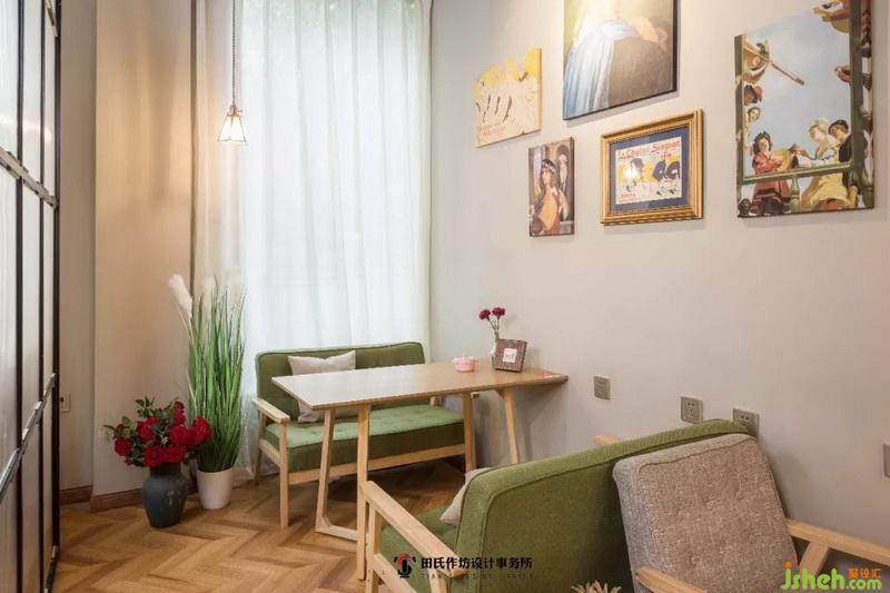 在這個分區(qū),就軟裝而言,呈現(xiàn)出現(xiàn)代簡約的風(fēng)格,豆沙綠的布藝沙發(fā)、原木色的桌椅無不彰顯著極簡主義。墻面則采用了單一的灰色涂料,大小不一色彩對比強(qiáng)烈的幾幅油畫又為整面灰墻增添活力。