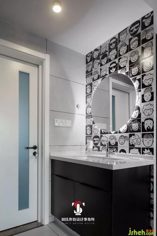 客衛(wèi)干濕分區(qū),墻磚選擇了可愛的圖案,給干凈利落的黑白空間中添加了一些活潑的元素。
