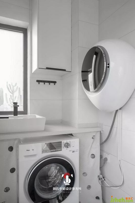 陽臺(tái)的洗手池方便日常小件衣物的清洗,壁掛式的小洗衣機(jī)絲毫不占用空間也不顯得累贅。