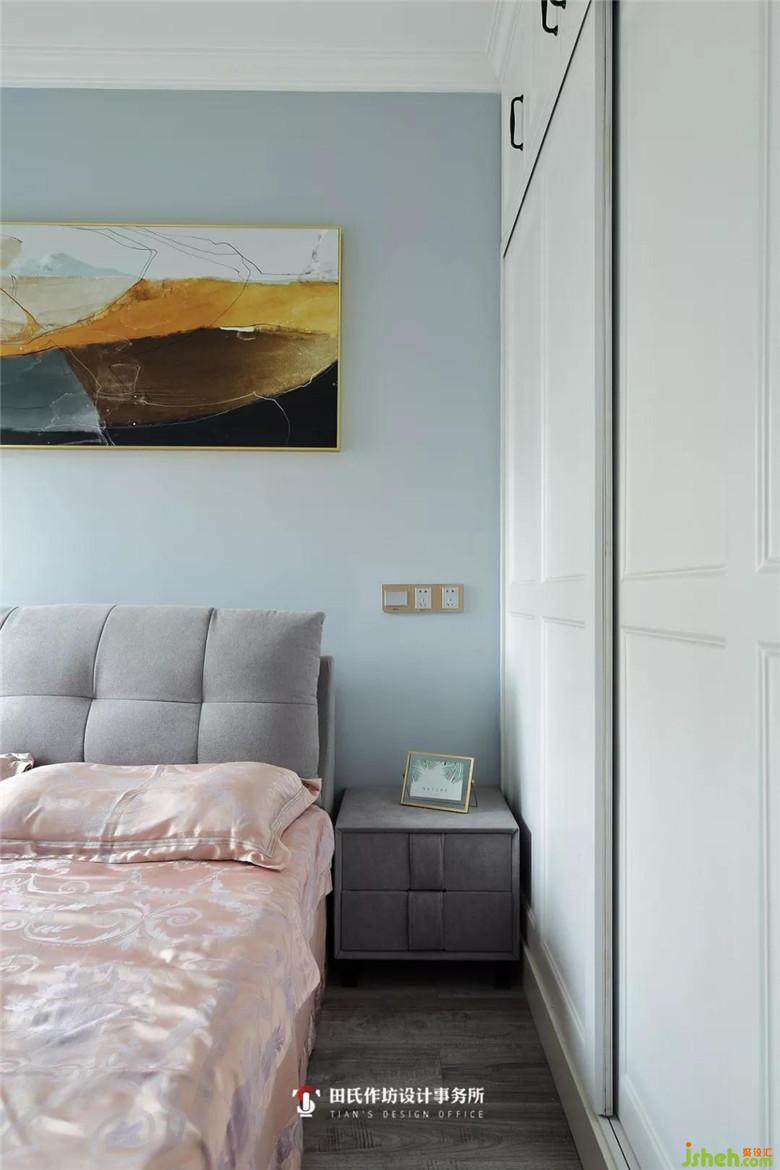 次臥墻面采用淺灰藍(lán),相較于主臥而言,給人一種更輕松的感覺(jué)。床靠和床頭柜則是絨面軟包的材質(zhì),給人溫暖放松之感,也使次臥整體顯得更為大氣,也將復(fù)古歐式的風(fēng)格發(fā)揮到極致。