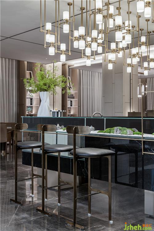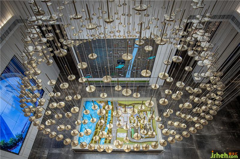 沙盤(pán)區(qū)至上而落的藝術(shù)燈具,以“水滴”漣漪在水中變幻形態(tài)為設(shè)計(jì)發(fā)想,輕盈飄逸。整體視覺(jué)空間形成聚焦,令觀者留下深刻記憶點(diǎn)。