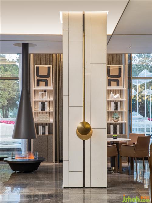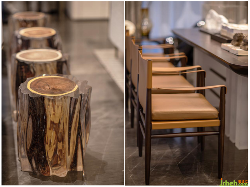 整個空間中最好的景致,莫過于緊鄰玻璃幕墻的洽談區(qū)域,外景引入室內(nèi),更烘托花墩坐月的意境。圓形畫面展示滿月狀態(tài),飾品營造彰顯坐態(tài)輕松。