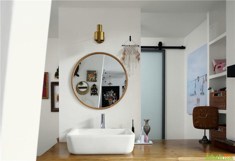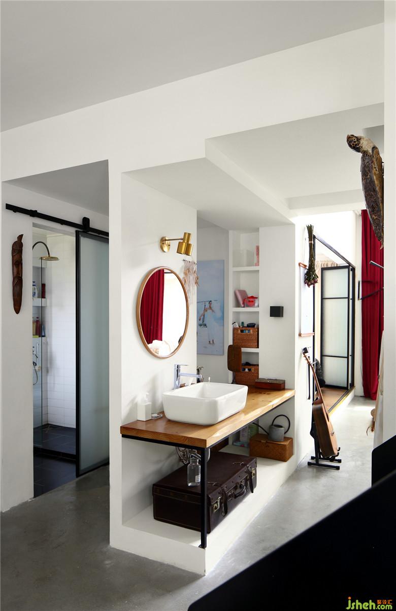 ▲干區(qū)簡(jiǎn)白臺(tái)盆+原木臺(tái)面的組合與整個(gè)空間氛圍完美契合,即便是管道外露無(wú)遮蔽,也是為這個(gè)空間增添了一抹迷人的工業(yè)風(fēng)FEEL。洗浴室融入了更多的現(xiàn)代氣息,磨砂玻璃移門(mén),黑色軌道外露與整體空間融合且富有質(zhì)感。