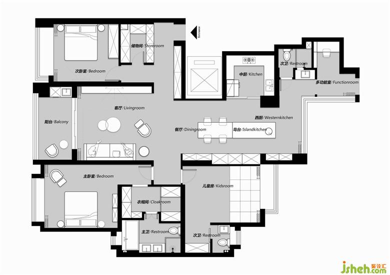 兒童房的設(shè)計盡可能多的給予孩子活動空間,并增加了一個小的衛(wèi)生間,對于大戶型來說更加方便孩子使用。配色上使用深藍色,黑色和湖藍色增加視覺效果,體現(xiàn)兒童房的活潑性。