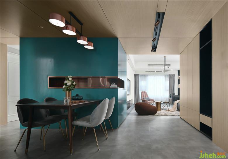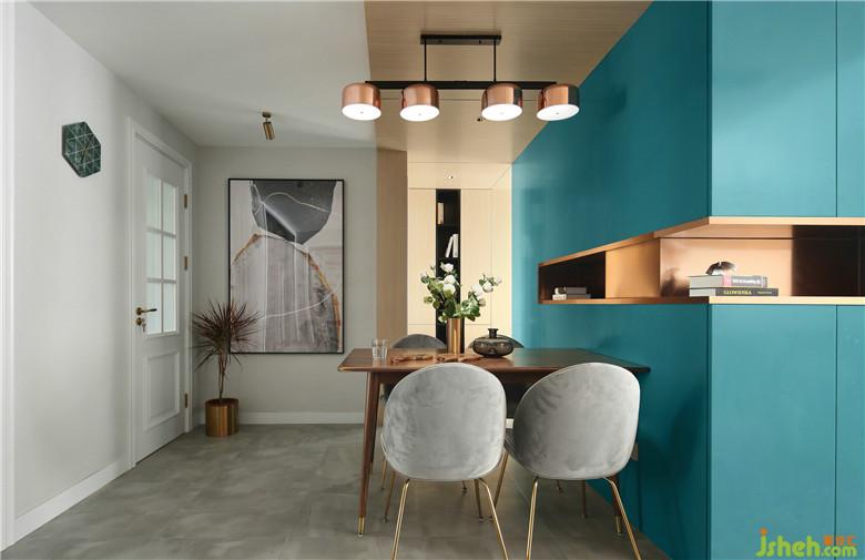 ▲一入戶我們便被餐廳中定制的藍(lán)綠色餐邊儲物柜牢牢抓住了視線,與空間造型結(jié)合設(shè)計的柜體以獨(dú)立的姿態(tài)形成空間中的轉(zhuǎn)折與過渡區(qū)域。柜體以局部開放的形式將玫瑰金與藍(lán)綠色巧妙地進(jìn)行搭配,而餐廳吊燈的色彩選擇上與之相輔相成,起到了畫龍點(diǎn)睛的效果。