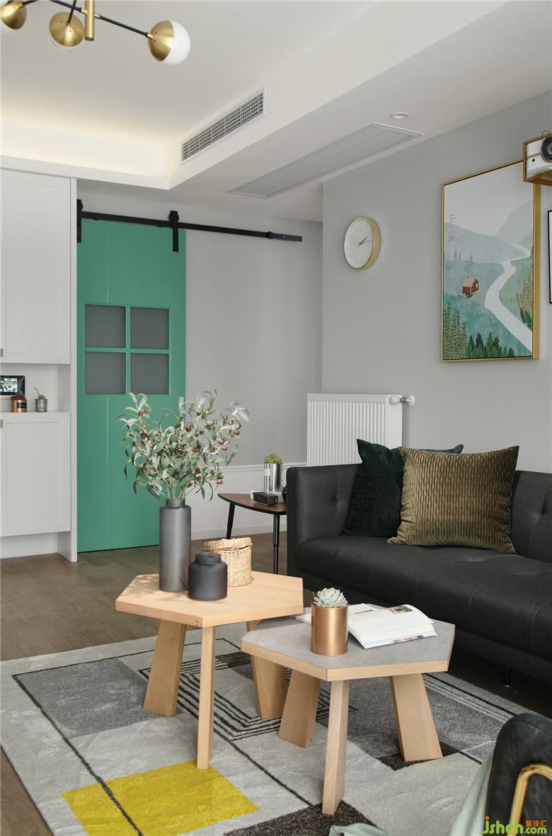 ▲將原戶型陽(yáng)臺(tái)并入客廳擴(kuò)大區(qū)域,也增加了客廳的采光使之更通透溫暖。室內(nèi)墻體以淺灰色為底,室內(nèi)設(shè)計(jì)師以深色家具作為重色壓住整個(gè)空間,將屋主喜愛的綠色貫穿到室內(nèi)裝飾上,裝飾畫、抱枕亦或是窗簾,都與全屋和諧的搭配著。