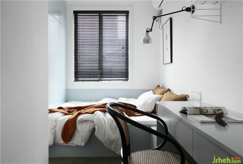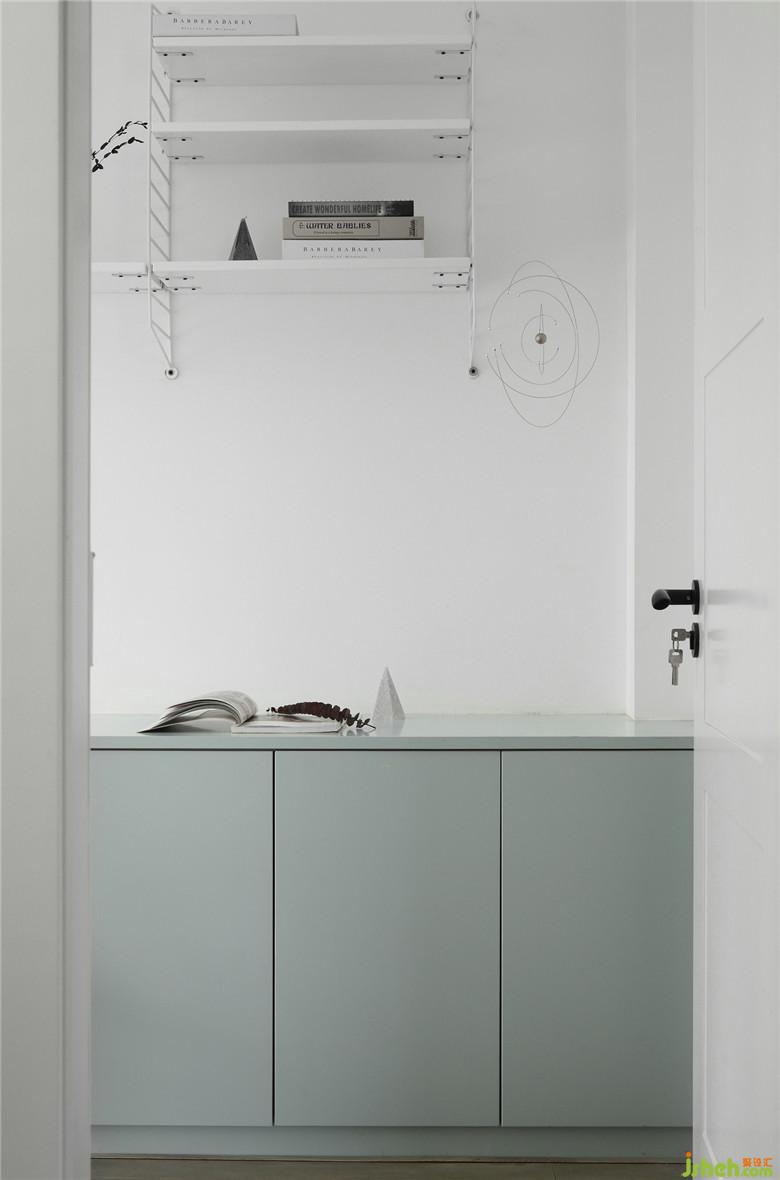 ▲次臥室空間將榻榻米、衣柜和床頭柜及書桌做了一體化結(jié)合設(shè)計(jì),而避免空間中單一色系,設(shè)計(jì)師將這片區(qū)域以清涼的薄荷綠冠以整體定制柜。這樣的整體定制設(shè)計(jì)不僅使空間利用率最大化,并且解決了空間儲物需求。墻上的置物架和裝飾品也都精心挑選,盡力將空間更具美好而有設(shè)計(jì)細(xì)節(jié)。無設(shè)計(jì)不生活。