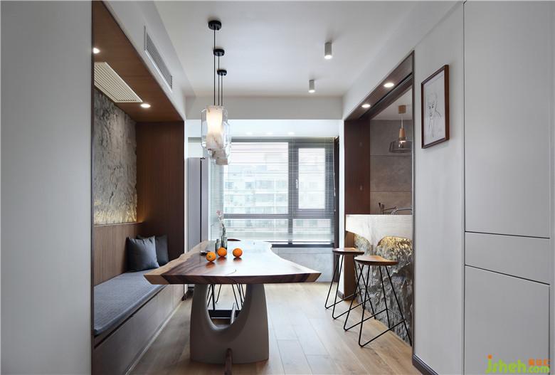 客廳空間渲染出大塊大塊的白色,是簡(jiǎn)約、干凈的底色。設(shè)計(jì)師將電視背景墻設(shè)計(jì)成了有趣的一部分,一半封閉一半通透,視覺(jué)上產(chǎn)生了微妙的平衡。既不會(huì)有完整一塊撲面而來(lái)的擁堵感,也不會(huì)有將休閑區(qū)暴露無(wú)遺的尷尬,客廳與休閑區(qū)連接著是半遮半露的自由與內(nèi)斂氣息。考慮到也有分隔的需要,設(shè)計(jì)師選用了折疊門,隱秘和自由都可以擁有,拉上之后可以作為獨(dú)立客房使用。為了豐富電視背景墻的視覺(jué)效果,室內(nèi)設(shè)計(jì)師采用了新材料,將玻璃纖維處理成石頭的肌理,噴上石粉,嵌入電視背景墻的外框中,與白色的柜體,胡桃木的包邊組合,是自然、質(zhì)樸的風(fēng)貌。
