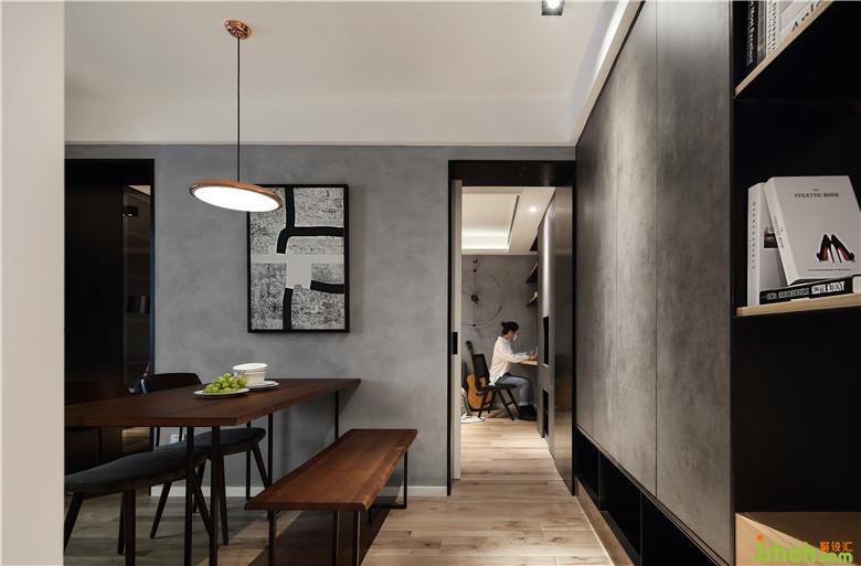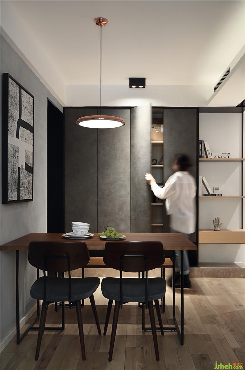 餐廳沿一側墻面設立定制柜體以及置物架的組合形式,可以更好地的適用于原本就不大的空間,隱秘收納與開放式架子結合,滿足多種需求,底部的開放式選擇方便進出門的鞋物擺放。柜門的啞光灰色進口仿巖板,為餐廳空間沉淀出細膩內斂的背景。置物架搭配了原木色的飾面板,淺木色讓沉穩(wěn)的空間趨于柔和。
