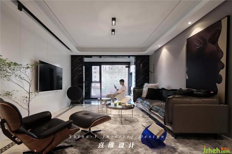 皮質(zhì)的沙發(fā)輪廓分明,灰黑的配色與白色電視背景墻相對,視覺感更具張力。帶腳凳的伊姆斯椅,符合人體工程學(xué)的設(shè)計(jì)配合內(nèi)側(cè)的皮質(zhì)軟墊,是復(fù)古的輕奢兼具現(xiàn)代外型的自由體驗(yàn)。