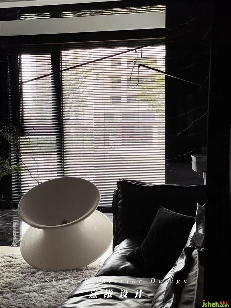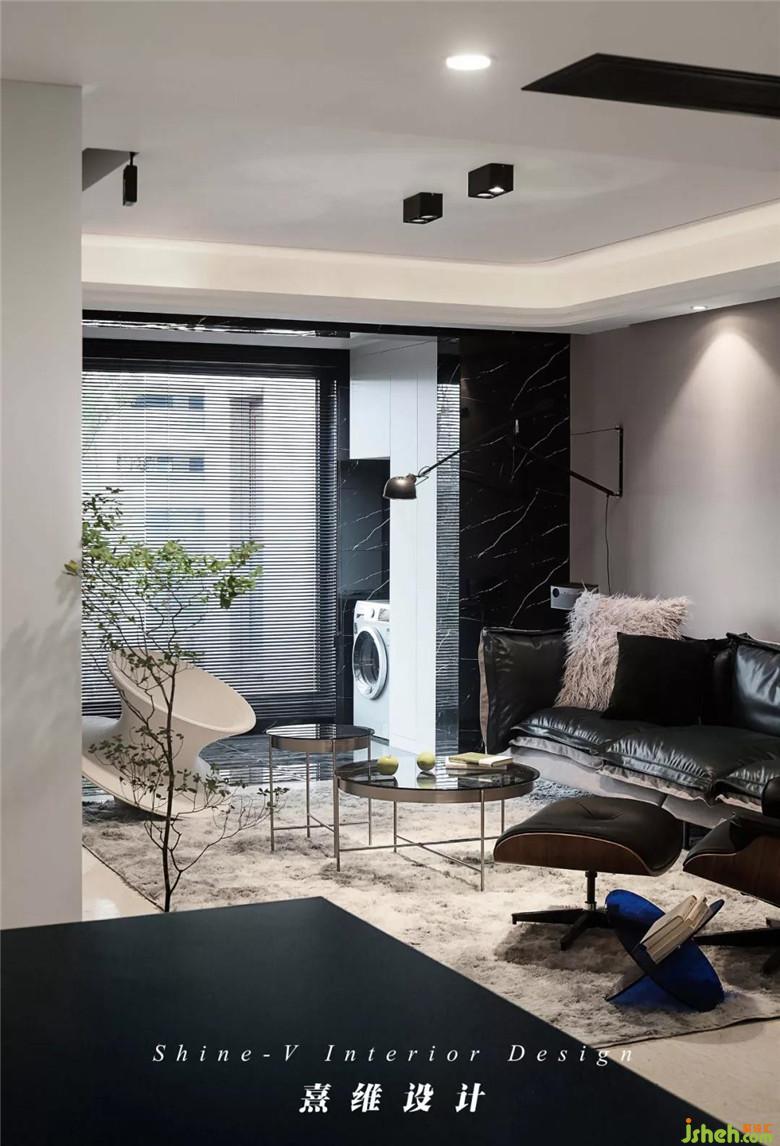 丹麥Bang&Olufsen音箱與Magis的陀螺椅,一黑一白,也是整個空間改造后所遵循的主要配色,分明又飽含張力,區(qū)別于傳統(tǒng)家具外型設(shè)計(jì)的轉(zhuǎn)折,保證功能之下,又額外為家中增加的趣味。封閉之后的陽臺,拆除移門與客廳連通起來,在黑色瓷磚包圍的陽臺中,白色的陽臺柜增加了儲物空間,小小的功能分區(qū)配色也與整體空間呼應(yīng)。