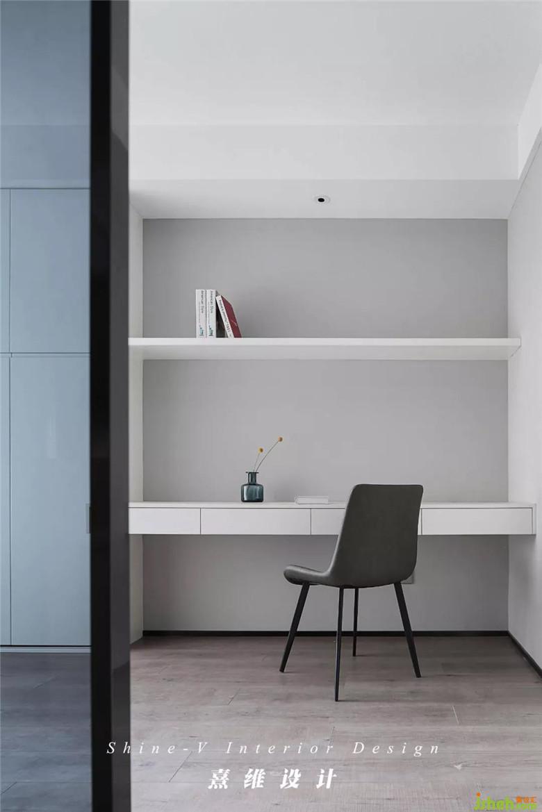 ▲休閑區(qū)是書房、客房、補充收納的多功能集合空間,劃分出一部分空間讓衛(wèi)生間的功能得以完整,裝修公司又納入部分陽臺,增添臨窗地臺與翻轉(zhuǎn)車,可以成為客房使用。書桌選擇現(xiàn)場制作,簡潔明了,更加契合實地并不規(guī)則的房間。