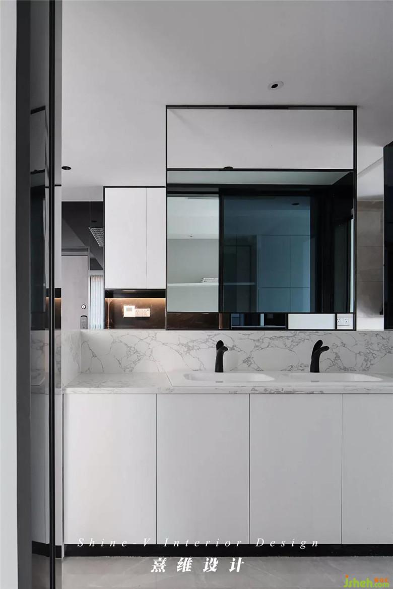 ▲充足的空間讓衛(wèi)生間干區(qū)可以完善的展開,白色大理石與白色柜體,是美觀與收納兼得。