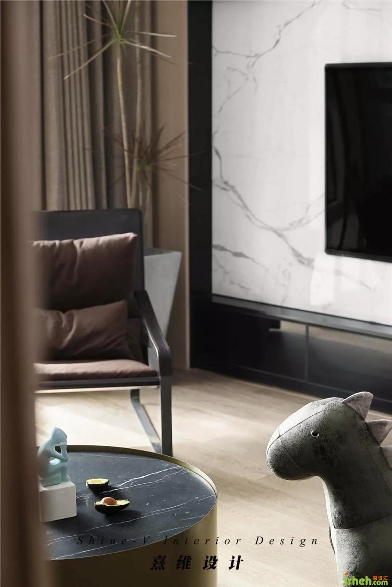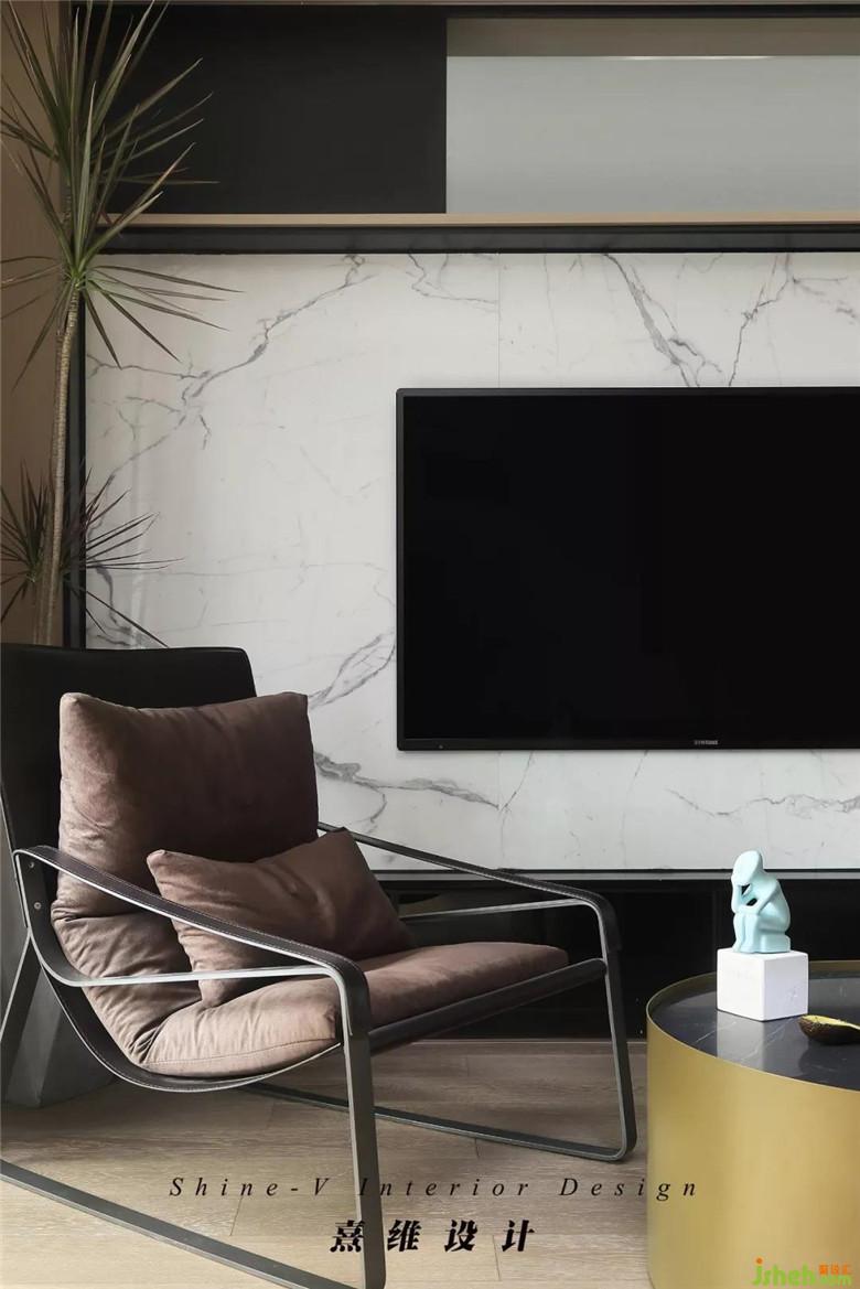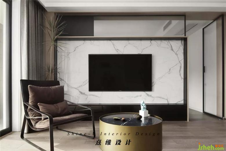 ▲電視背景墻的塊面是黑白分明,大理石紋路為清爽、裝修公司利落的配色增添細節(jié),立在角落里的千年木姿態(tài)舒展帶來生機。