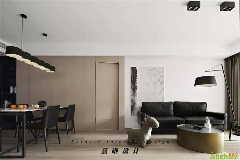 ▲白墻襯著黑色皮質沙發(fā)有一點酷,臥室的隱形門藏在飾面板連綿的木色里,沙發(fā)這一側的配色呈現在更大塊面中,更顯家的舒展姿態(tài)。
