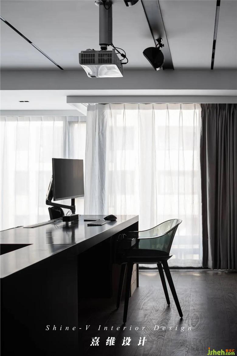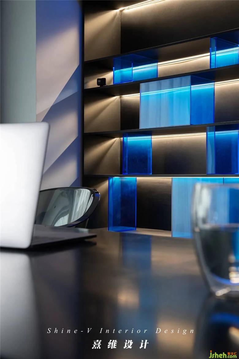 ▲工作區(qū)的柜體,一部分是開放柜,封閉樣式的另一部分其實是下翻床。開放柜內(nèi)裝置上燈帶,擺上定制的亞克力小盒子,光透出來,這些不再是冷冰冰的幾何組合,傳達出一種持續(xù)性的、神秘的迷失感,像引人探索的科幻未來,格外適合家庭中小影院的低暗氛圍。