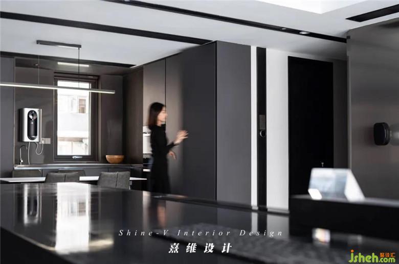 ▲到頂?shù)墓耋w包容餐廚電器及雜物,與島臺(tái)的地柜建立連接,為餐廳提供可觀的存儲(chǔ)空間。貫穿在空間中的深灰色柜體,啞光烤漆觀感細(xì)膩,連續(xù)的手法消除獨(dú)立感,于開放的空間中創(chuàng)造具有質(zhì)感的精神場(chǎng)域。