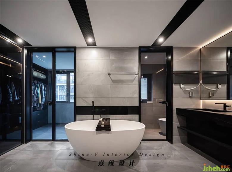 ▲裝修公司將原主衛(wèi)空間與鄰近的零碎小房間整合在一起,成為主臥套房的一部分。由于補(bǔ)充了足夠的空間,功能性得到極優(yōu)越的提升,浴缸放在中央,干區(qū)與梳妝臺(tái)分布在兩端,衣帽間、馬桶、淋浴間獨(dú)立于三個(gè)角落??臻g沒有分毫浪費(fèi),模塊之間相互關(guān)聯(lián)又互不打擾,在一起充分回應(yīng)使用者的需求。