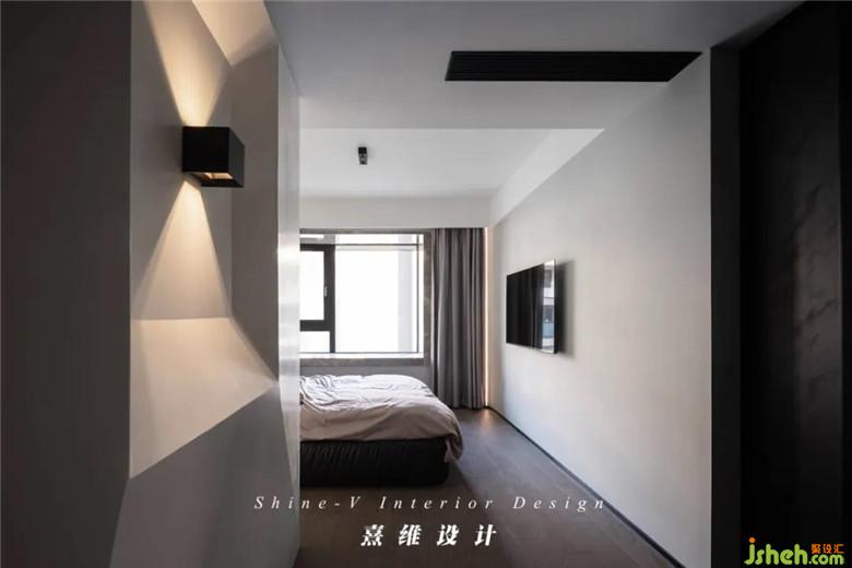 ▲仍以黑白灰著眼與主臥,黑色的色塊與線條勾勒出床頭輪廓,其間被襯托出的灰淺淺的拓展出溫度情感,白色的柜體緊挨黑色的線條,若月下見,輕薄的樣貌呈現(xiàn)出深邃與溫柔。