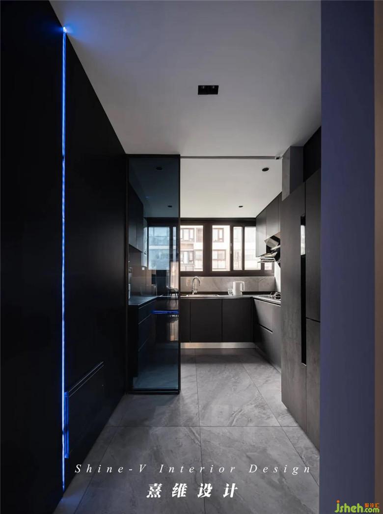 ▲入戶門一側(cè)的小房間連同陽臺(tái)被改造為中廚,用玻璃推拉門作為隔斷,保留空間過渡地帶的明亮通透。U型布局的啞光灰櫥柜加上雙側(cè)的吊柜,操作空間、收納空間維持在最大,以真實(shí)的生活體驗(yàn)感作為規(guī)劃的重點(diǎn)。